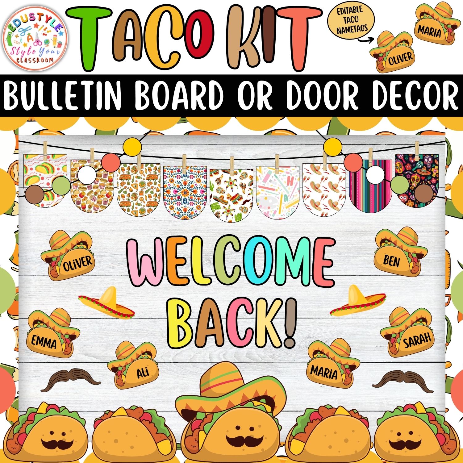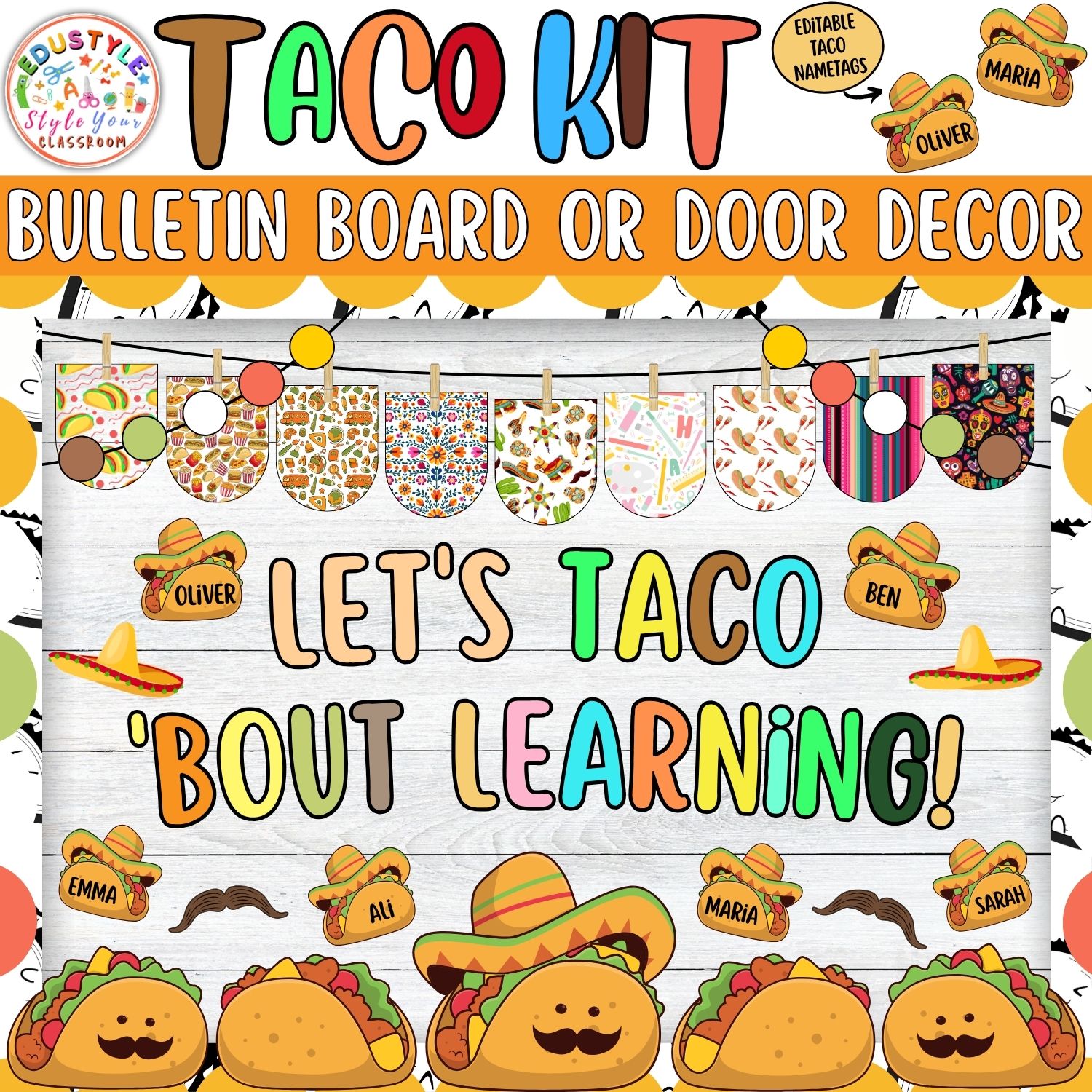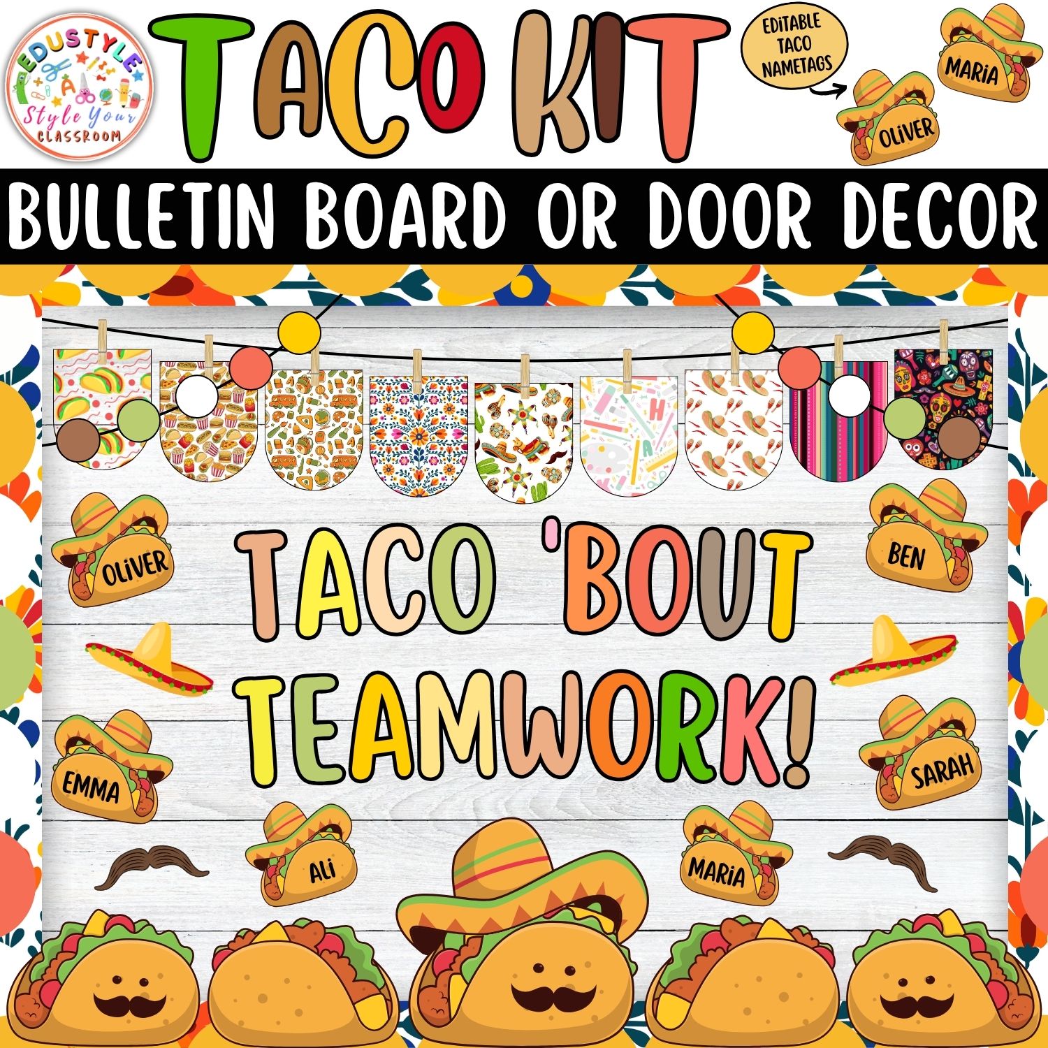 Turn your classroom into a fiesta of learning with this delightful Taco-Themed Bulletin Board & Door Decor Kit! Vibrant, fun, and filled with charming taco characters, colorful sombreros, mustaches, and editable taco nametags, this decoration set will inspire teamwork, positivity, and a zest for learning.