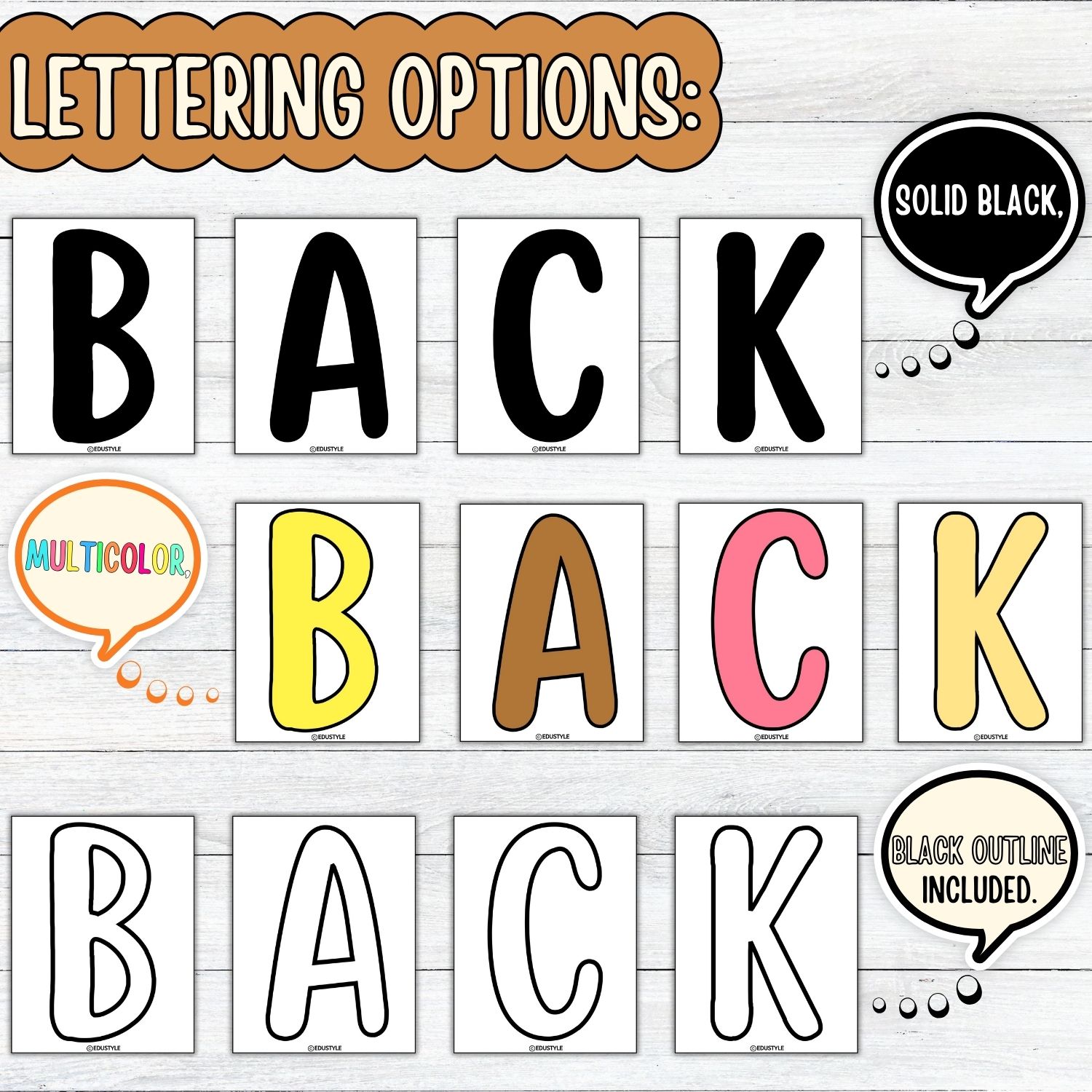 - Versatile Lettering Options: Solid black, multicolor, or outlined letters.