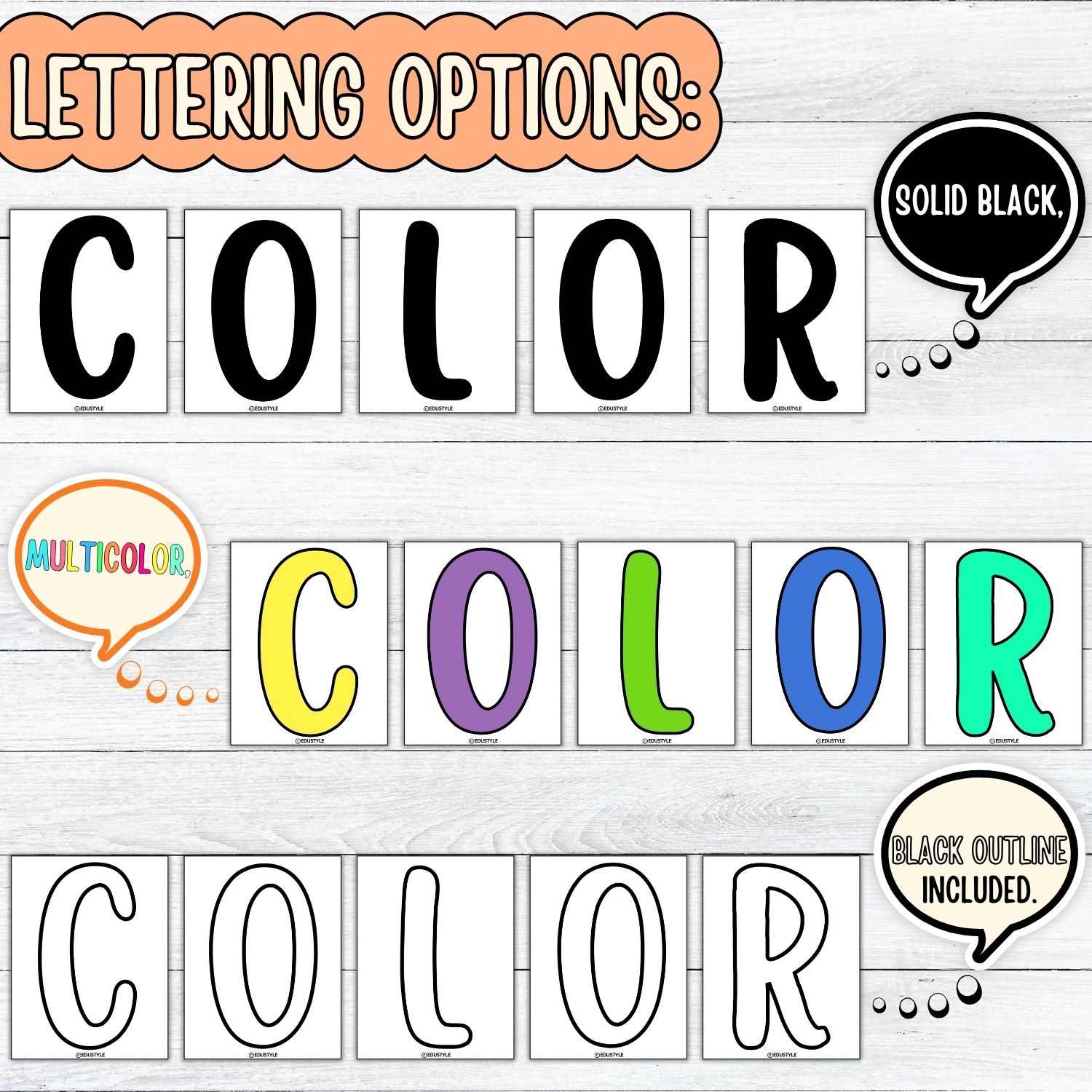 • Multicolor, solid black, and outlined lettering options to suit any theme or style
