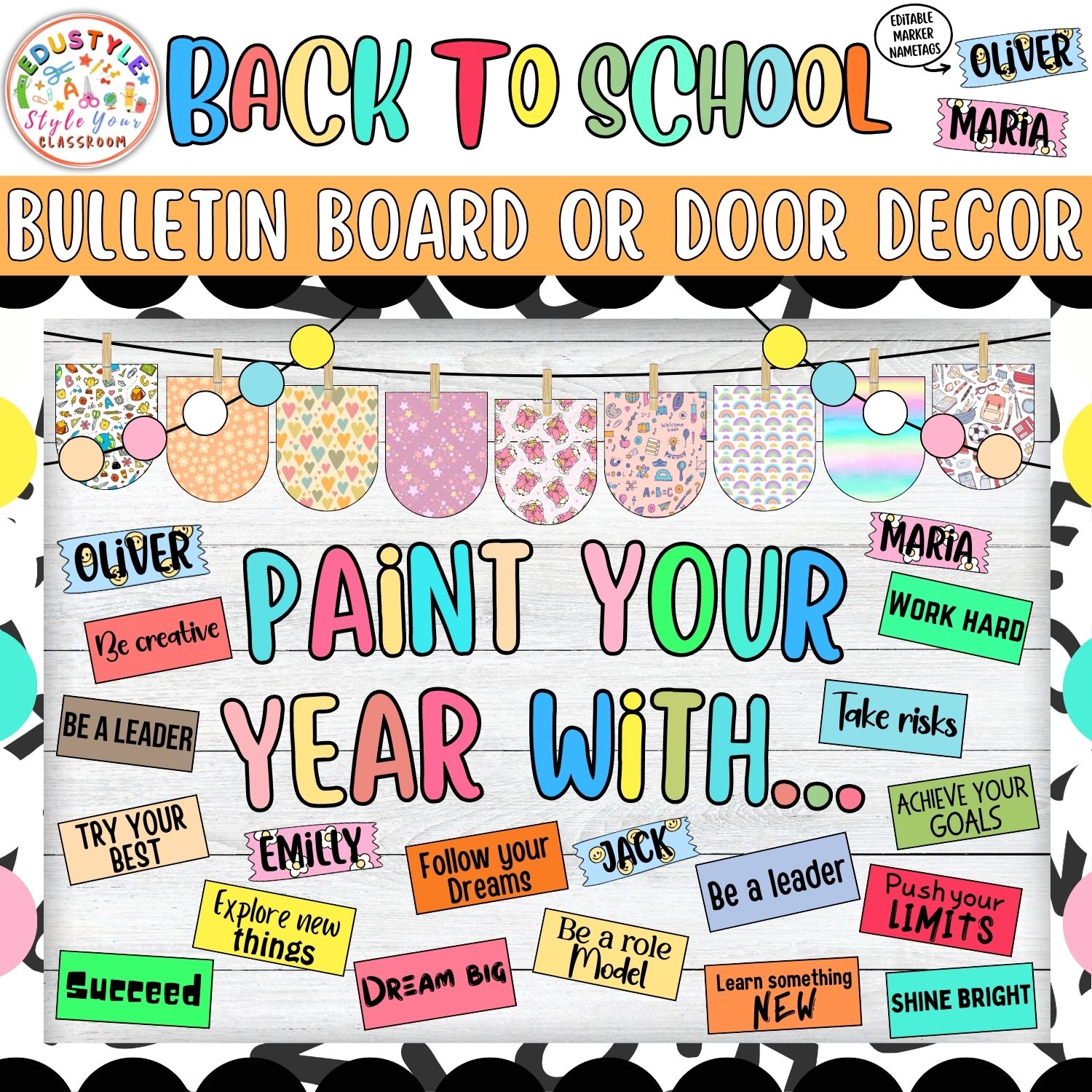 A: Yes! The motivational phrases and name tags are fully editable to suit your classroom’s unique needs.