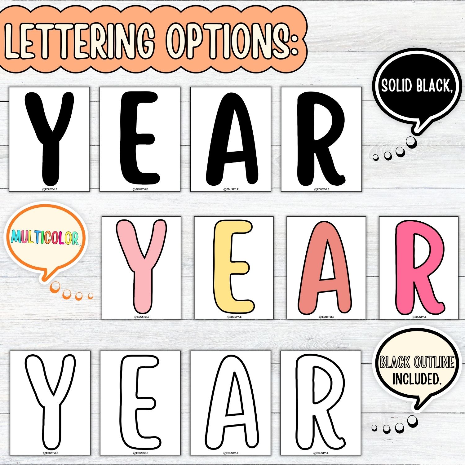 • Multicolor, solid black, and outlined lettering options to suit any theme or style
