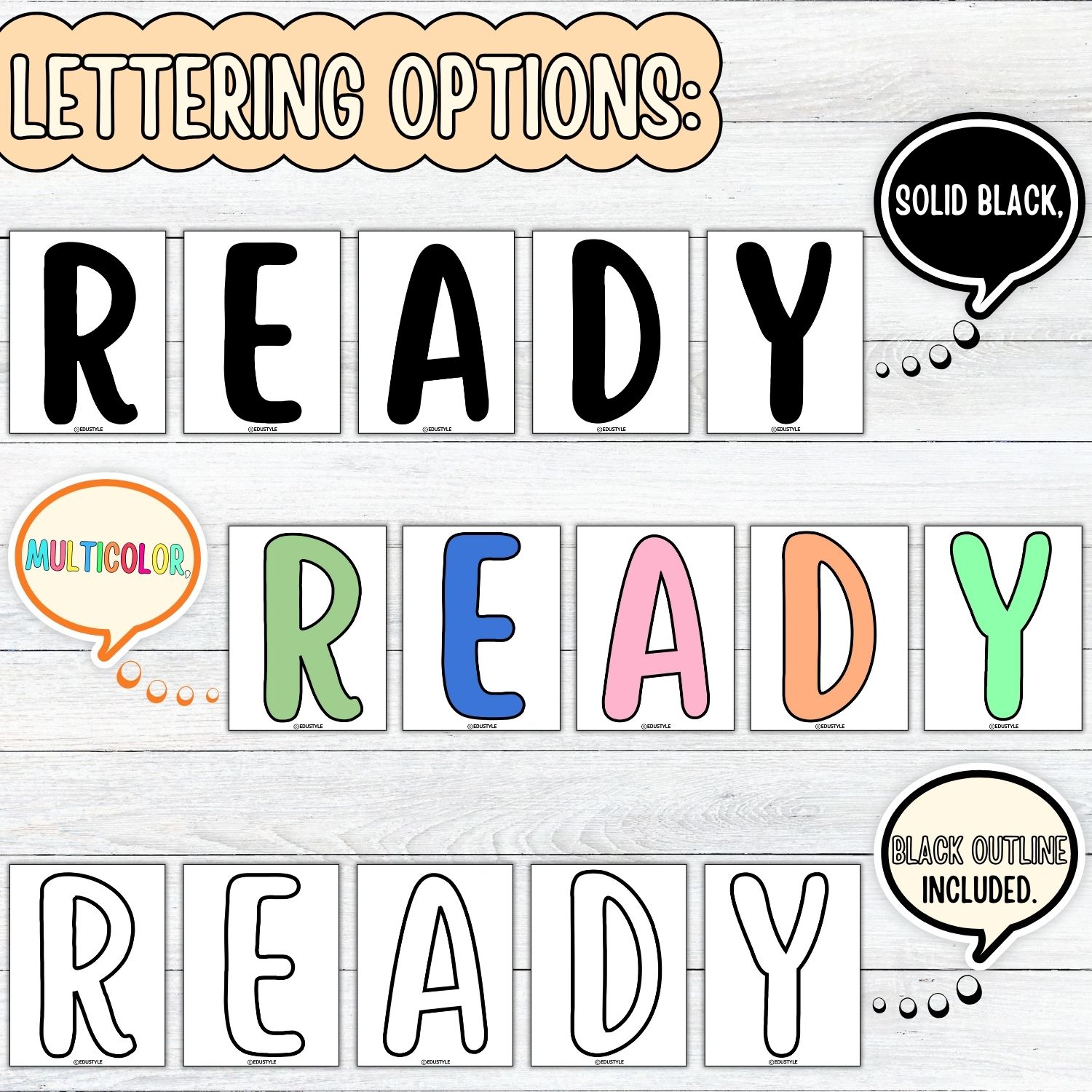 • Multicolor, solid black, and outlined lettering options to suit any theme or style