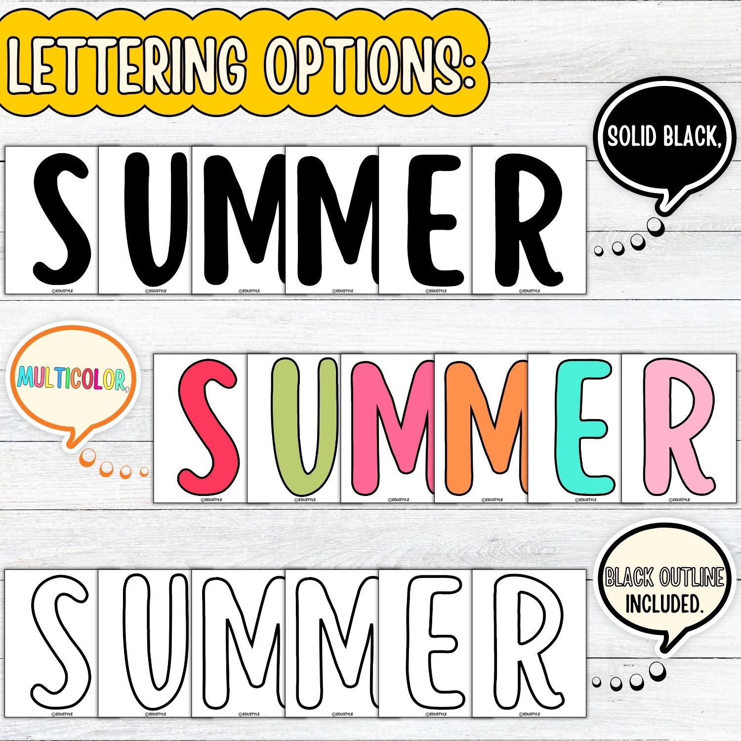 - Various lettering options: solid black, colorful, or outlined to perfectly match your creative vision.