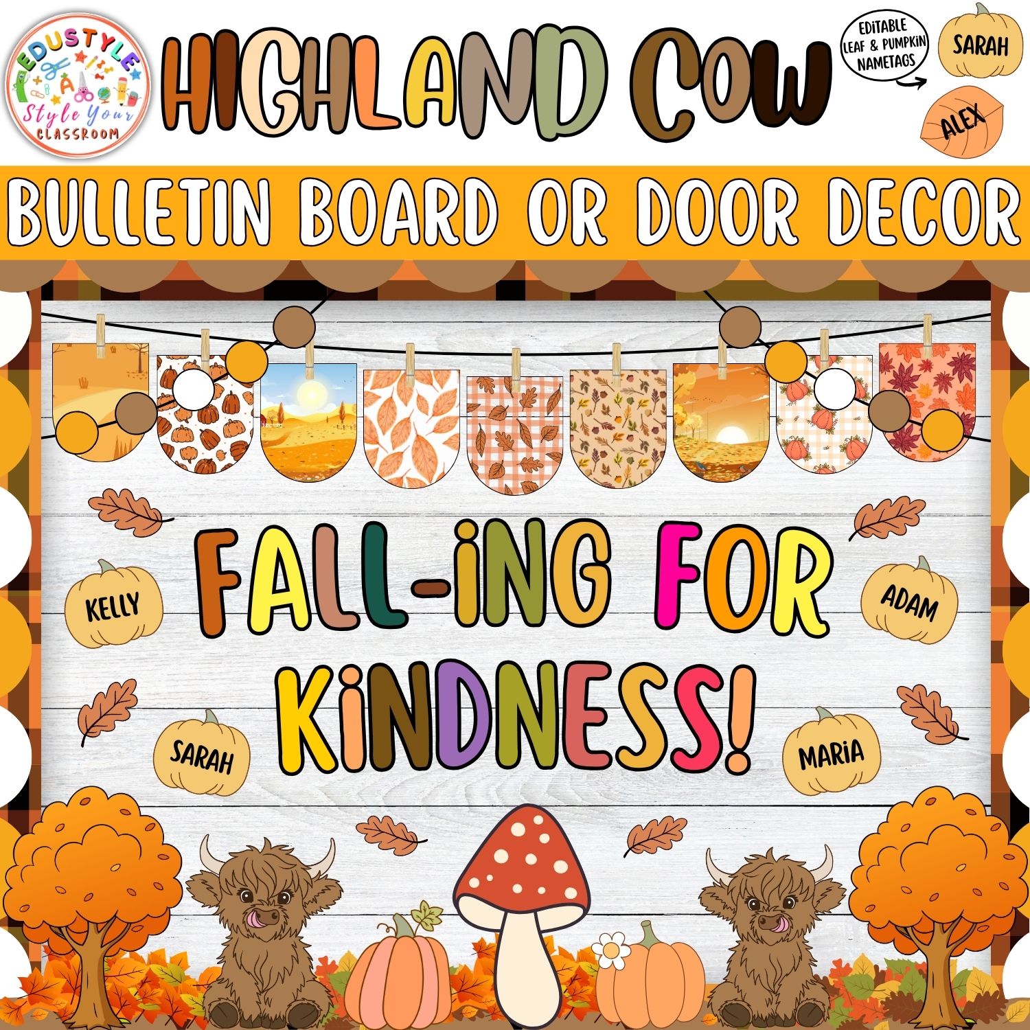 Celebrate the beauty of fall with our Highland Cow Fall Bulletin Board & Door Decor Kit! 🐮🍂 This cozy autumn-themed set is perfect for creating a warm and inviting classroom atmosphere. Featuring adorable highland cows, pumpkins, fall leaves, and editable name tags, this kit makes decorating fun, easy, and customizable for your students.