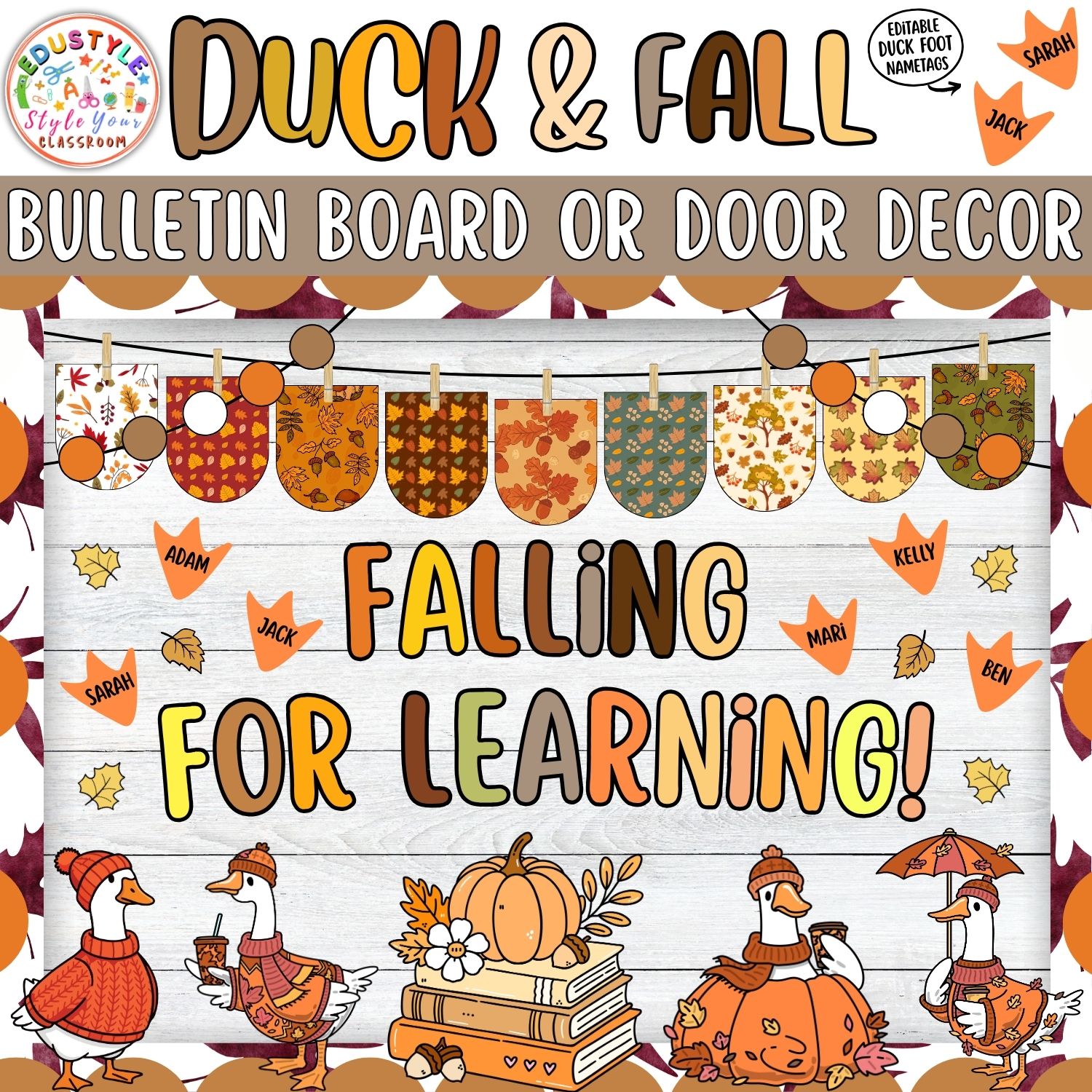 Welcome the cozy autumn season with our Duck & Fall Bulletin Board & Door Decor Kit! Perfect for creating a warm, inviting classroom environment, this set combines the charm of fall leaves, pumpkins, and adorable ducks dressed for autumn. With vibrant colors and editable elements, it’s an engaging way to celebrate fall, foster classroom community, and brighten up your walls, doors, or hallways.