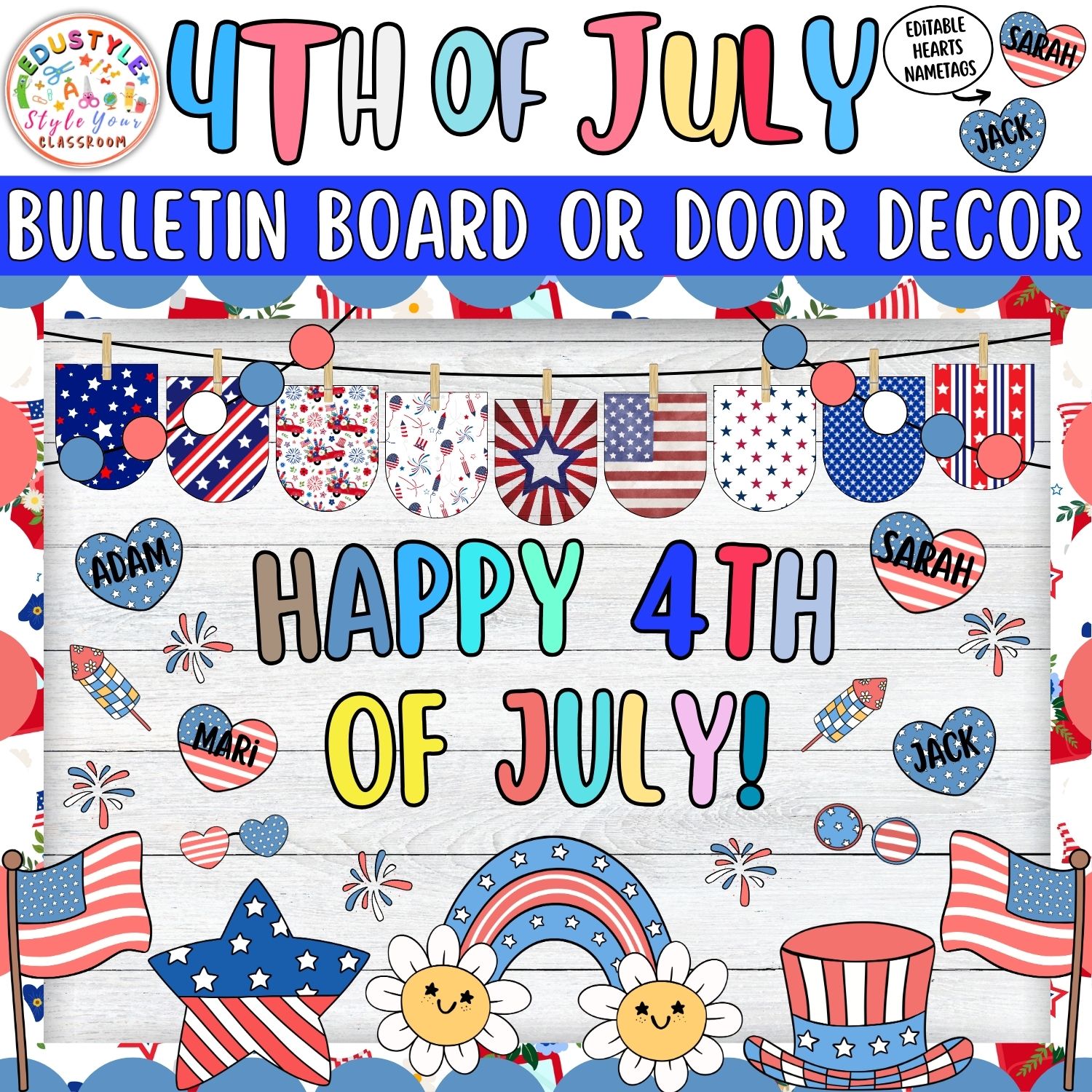 Featuring editable heart-shaped name tags, playful U.S. symbols, and inclusive character art, this decor bundle lets every student shine as part of the celebration. Whether you’re prepping for July 4th, Memorial Day, or a summer unit on American history, this cheerful theme adds spark and style!