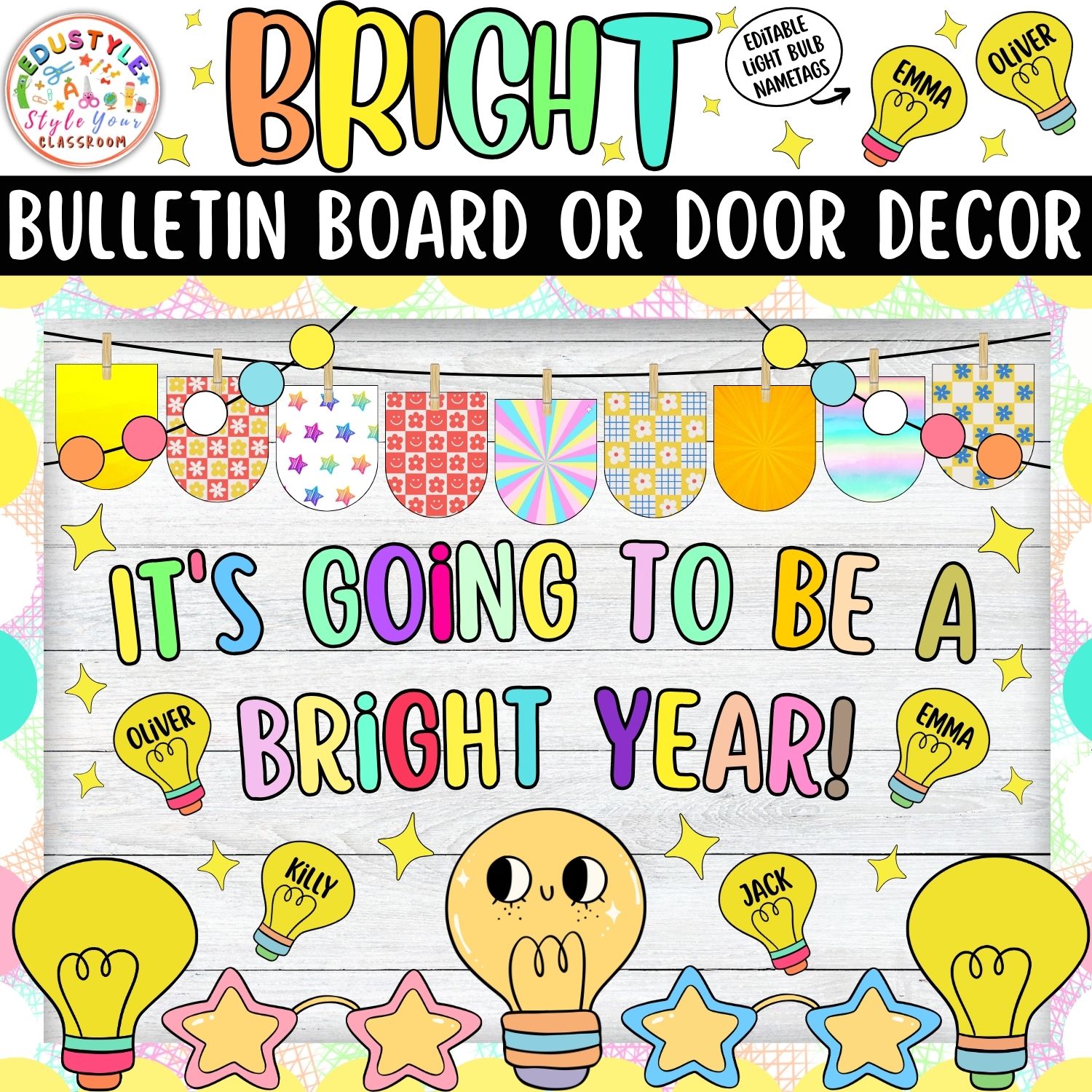 Featuring adorable, colorful graphics including cute lightbulbs, playful patterns, and editable name tags, this kit is ideal for teachers who love bright, engaging visuals.