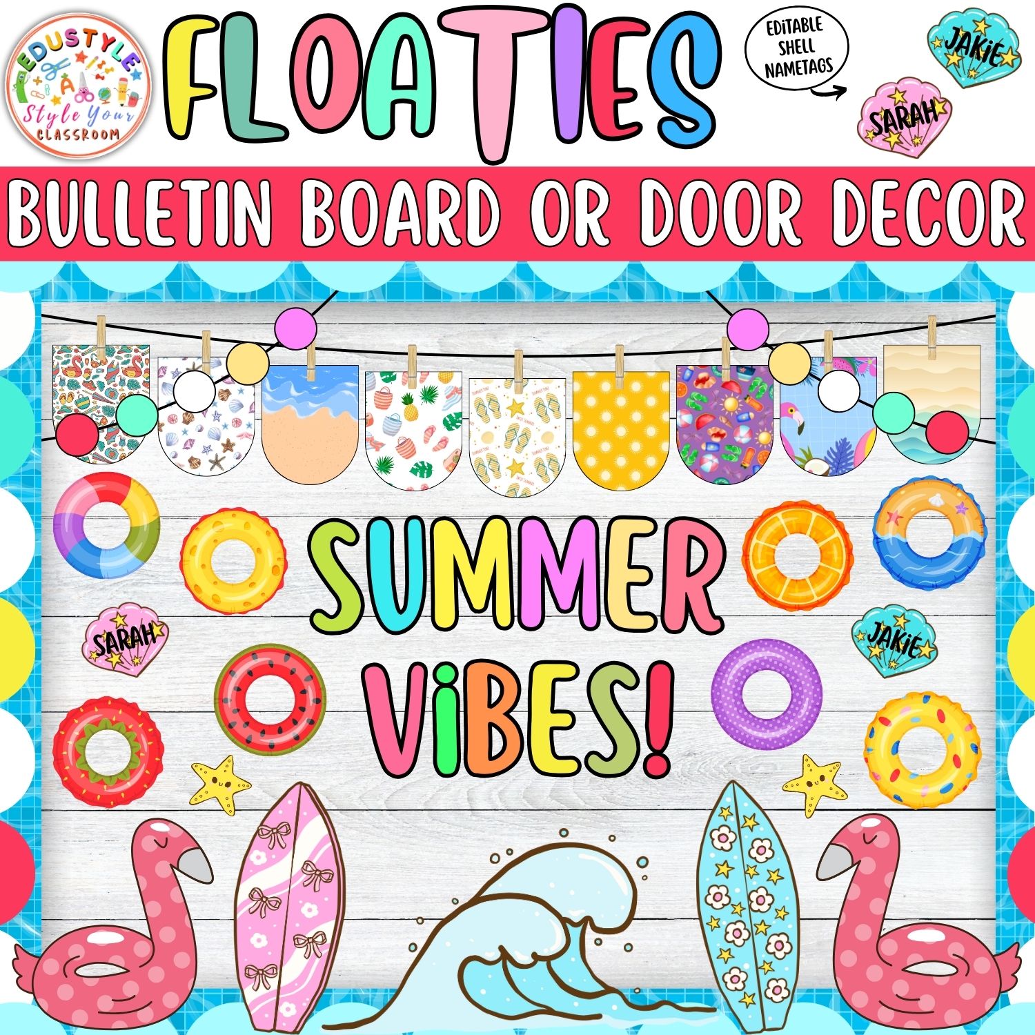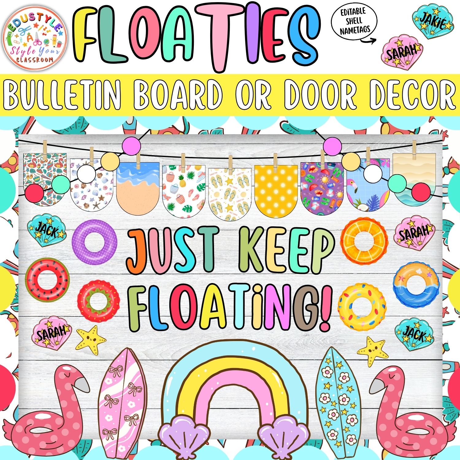 - 3 Full Bulletin Board Designs: āJust Keep Floating!,ā āSummer Vibes!,ā and āHello Summer!ā