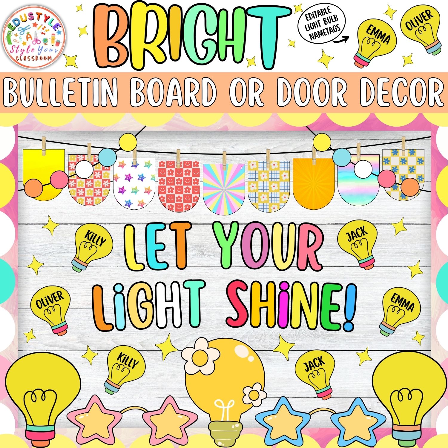 Featuring adorable, colorful graphics including cute lightbulbs, playful patterns, and editable name tags, this kit is ideal for teachers who love bright, engaging visuals.