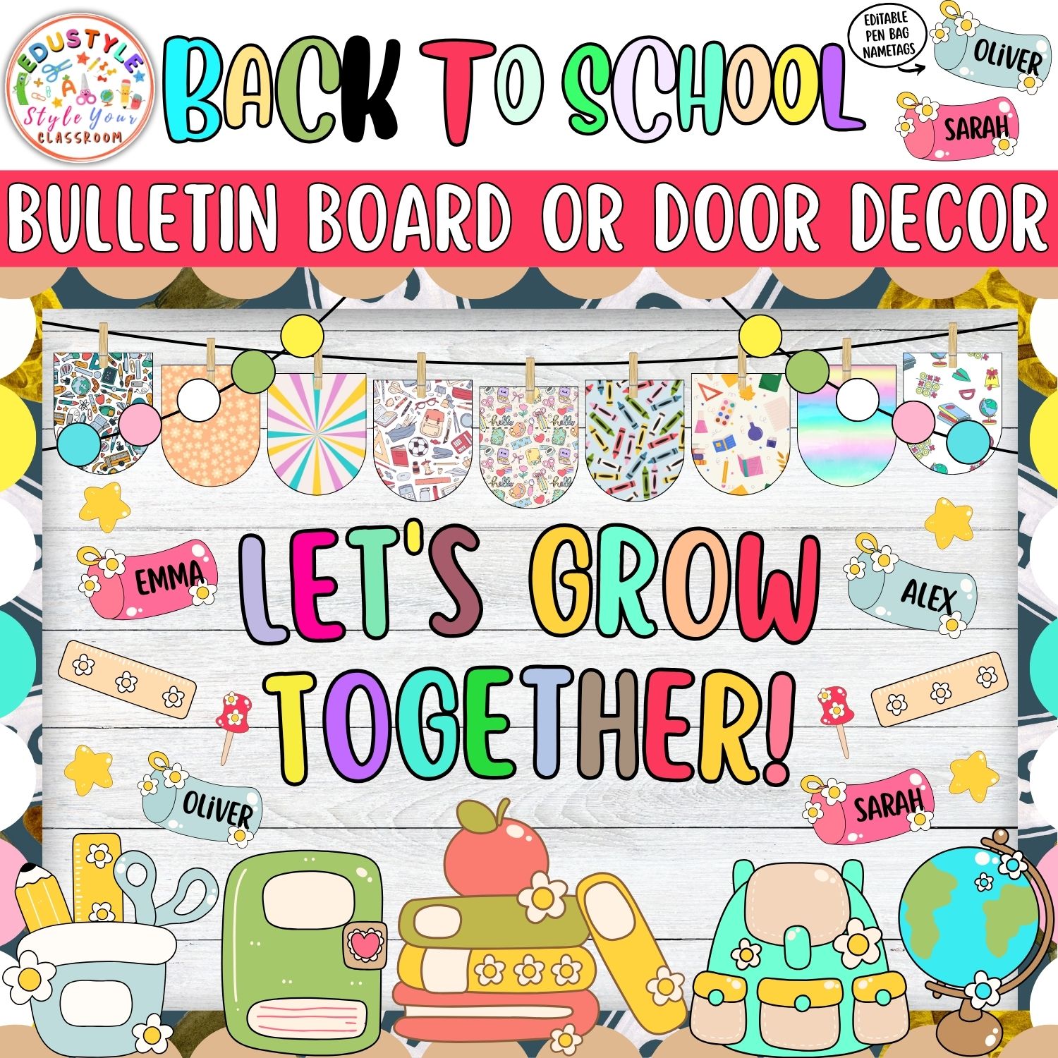 - Decorative Classroom Essentials: Charming illustrations of backpacks, notebooks, globes, and more to enhance visual appeal.