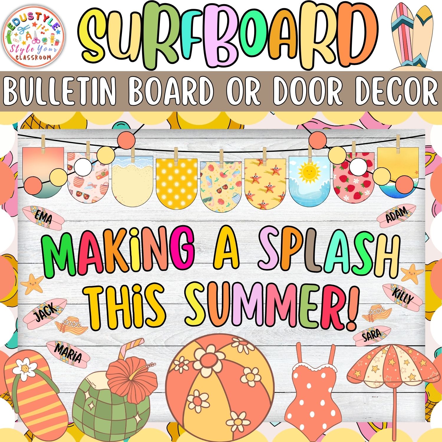 Decorate with summer elements like coconuts, beach balls, sunshades, and stylish surfboards – all ready for personalization. Editable surfboard name tags (PowerPoint file included) let you easily add student names digitally to celebrate your class in style!