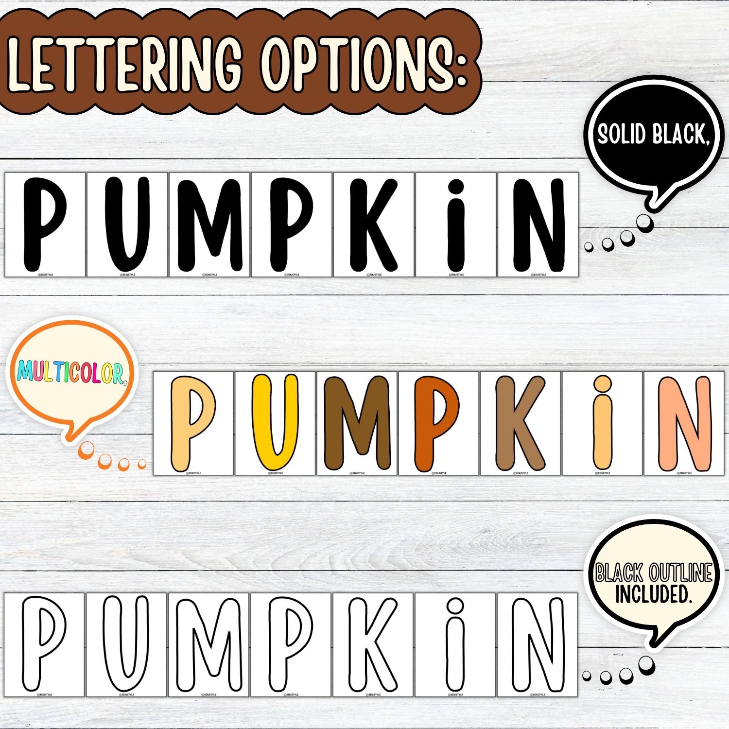 • Lettering Options – solid black, multicolor, and outlined for flexibility.