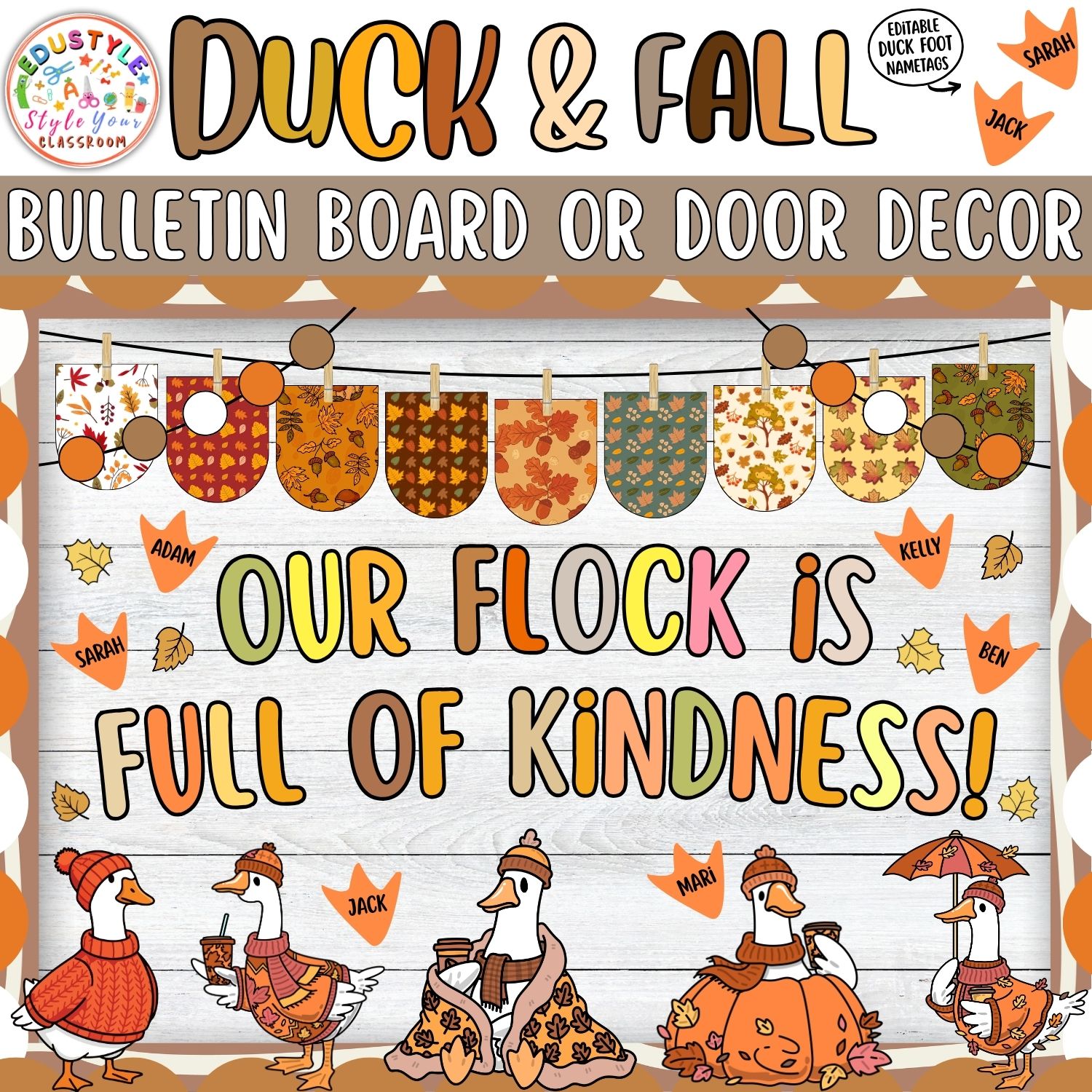 Welcome the cozy autumn season with our Duck & Fall Bulletin Board & Door Decor Kit! Perfect for creating a warm, inviting classroom environment, this set combines the charm of fall leaves, pumpkins, and adorable ducks dressed for autumn. With vibrant colors and editable elements, it’s an engaging way to celebrate fall, foster classroom community, and brighten up your walls, doors, or hallways.
