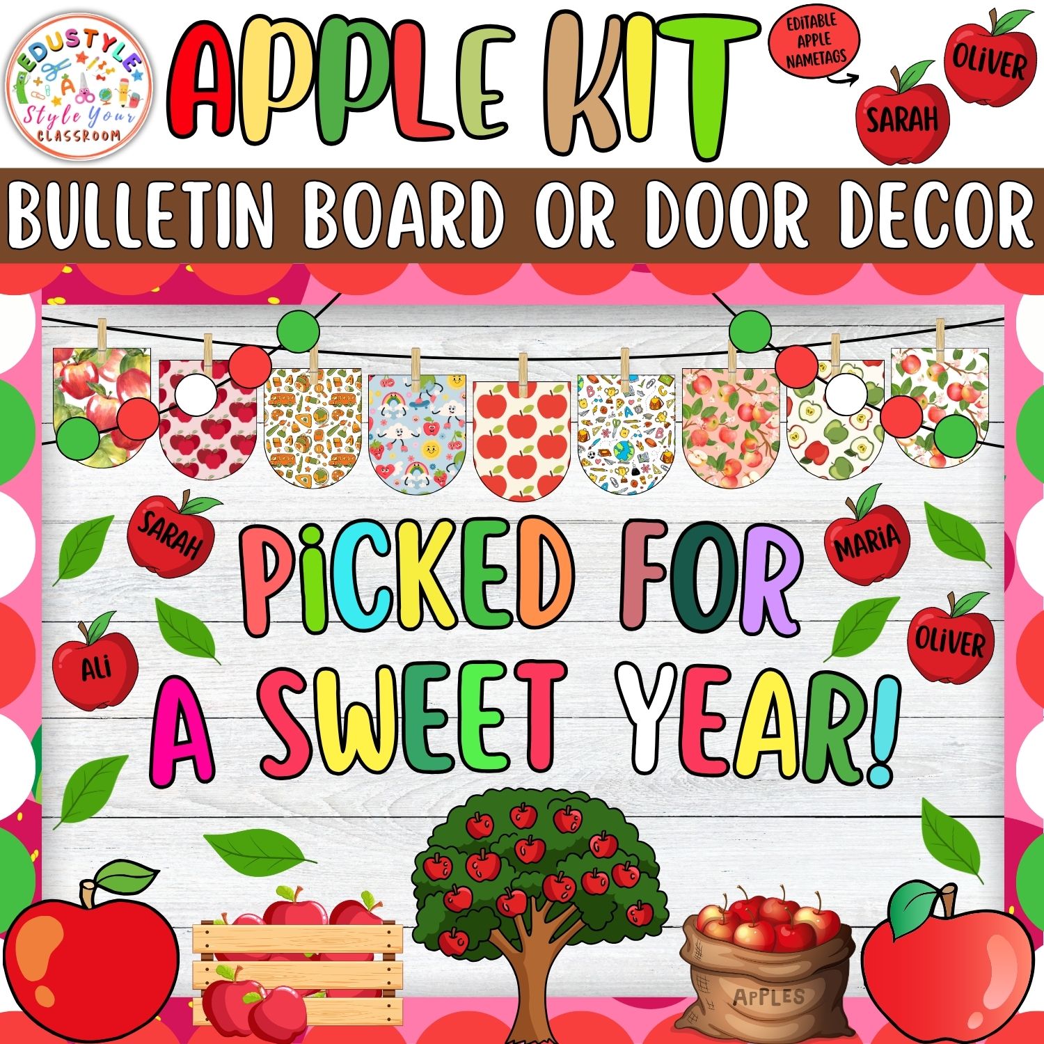 - This kit includes decorative apples, apple trees, baskets, vibrant patterned banners, editable name tags, and various lettering styles and motivational phrases.