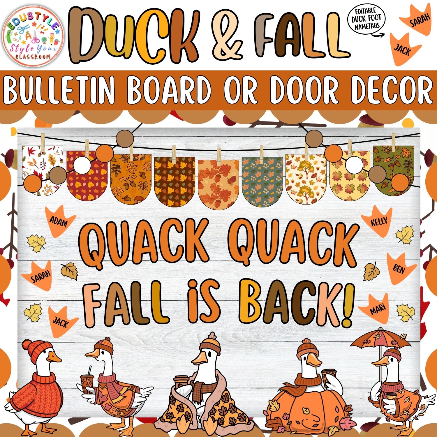 Welcome the cozy autumn season with our Duck & Fall Bulletin Board & Door Decor Kit! Perfect for creating a warm, inviting classroom environment, this set combines the charm of fall leaves, pumpkins, and adorable ducks dressed for autumn. With vibrant colors and editable elements, it’s an engaging way to celebrate fall, foster classroom community, and brighten up your walls, doors, or hallways.