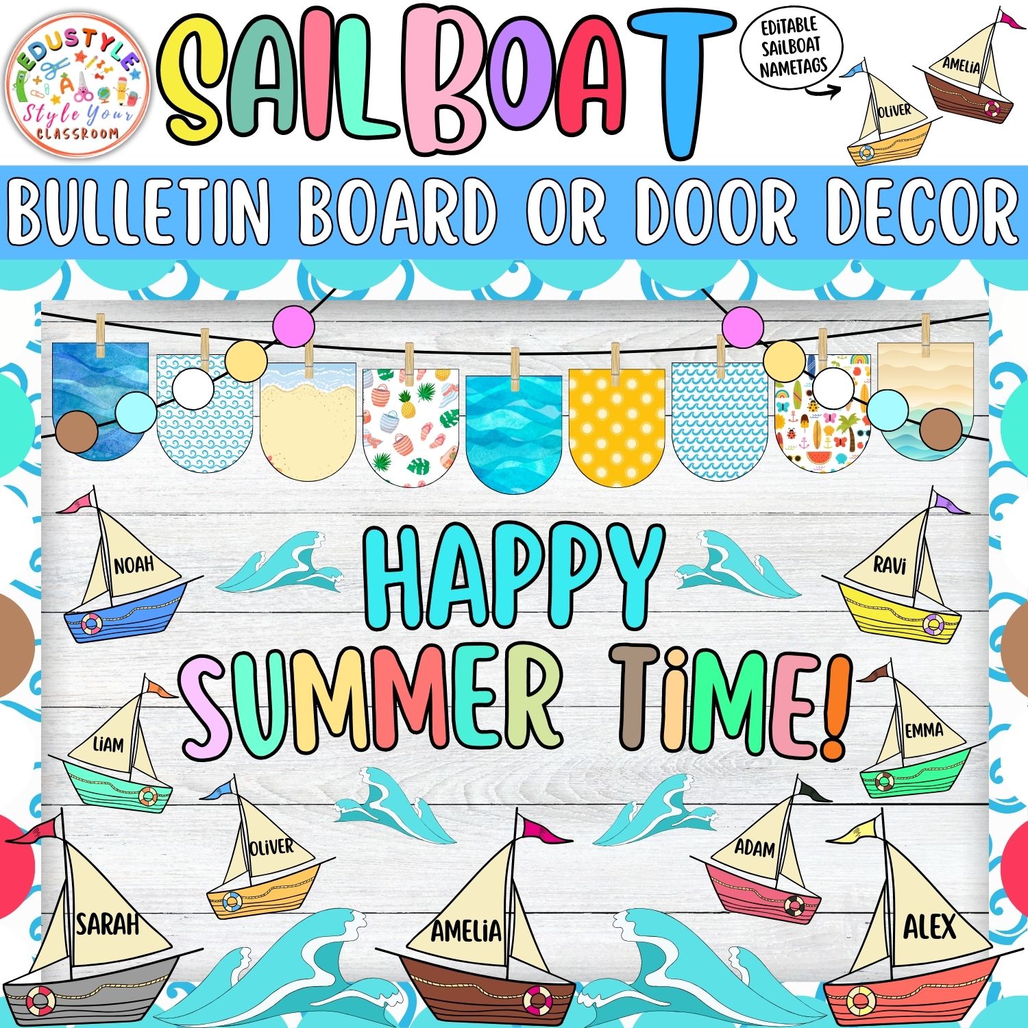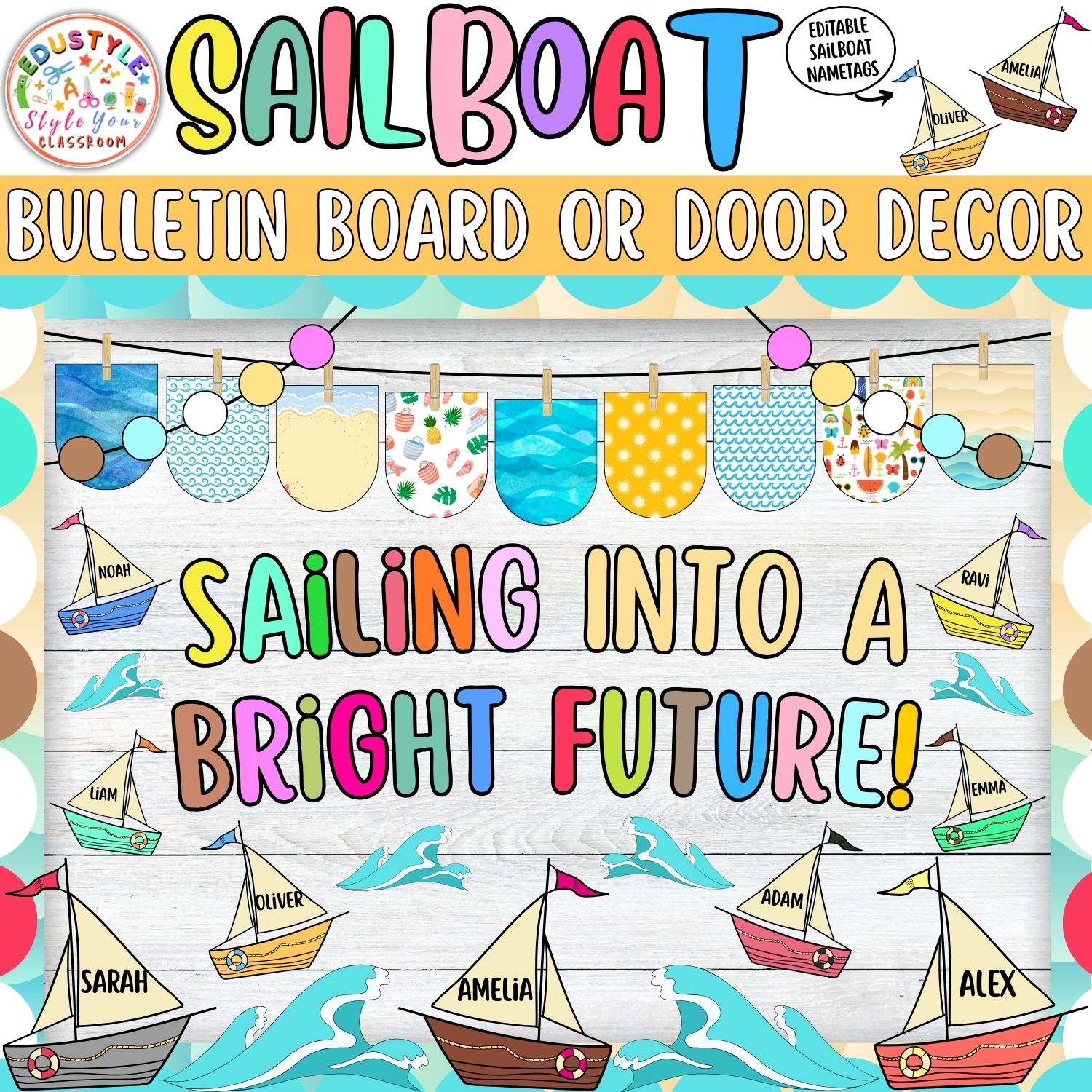 Featuring adorable sailboats with editable name tags, ocean wave graphics, vibrant banners, and customizable lettering, this decor is ideal for classroom doors, bulletin boards, or hallway displays.