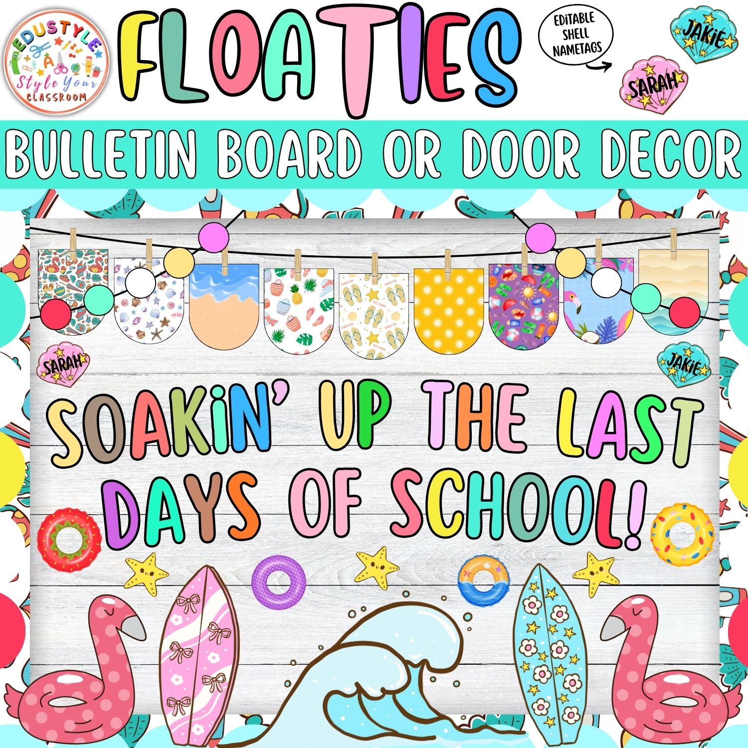 Make a splash into summer with this vibrantĀ Floaties-Themed Bulletin Board and Door Decor Set! Designed to energize your classroom or hallway, this playful kit is perfect for end-of-year celebrations, summer send-offs, or beachy welcome-back displays. With a rainbow of editable name tags shaped like colorful pool floaties and shells, you can easily personalize your board for each student or staff member!