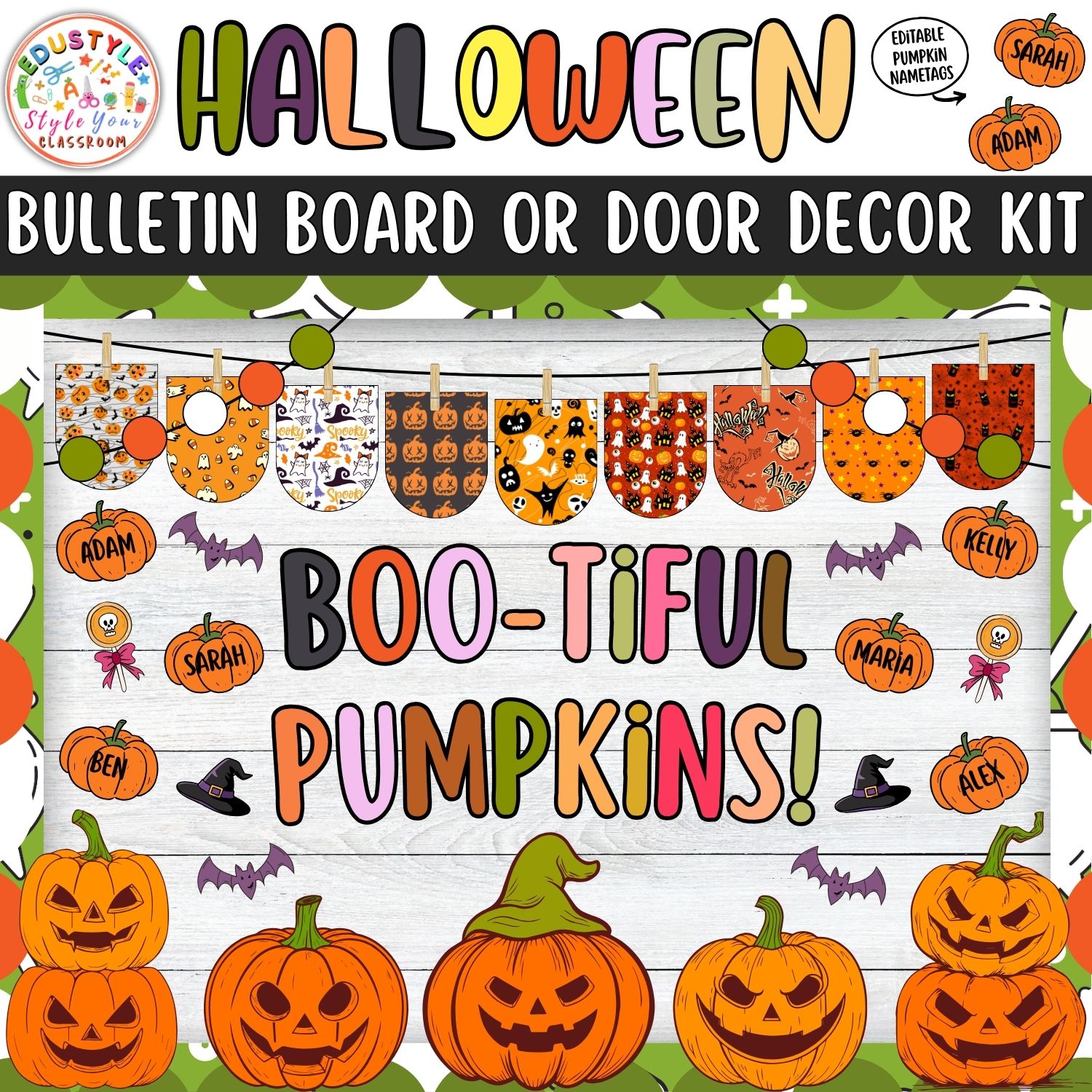 Welcome your students to a festive fall classroom with this adorable Halloween Pumpkin Patch Bulletin Board and Door Decor Kit! Filled with cheerful pumpkins, haunted houses, bats, and editable pumpkin name tags, this kit is perfect for creating a warm and spooky classroom atmosphere. 🍂👻