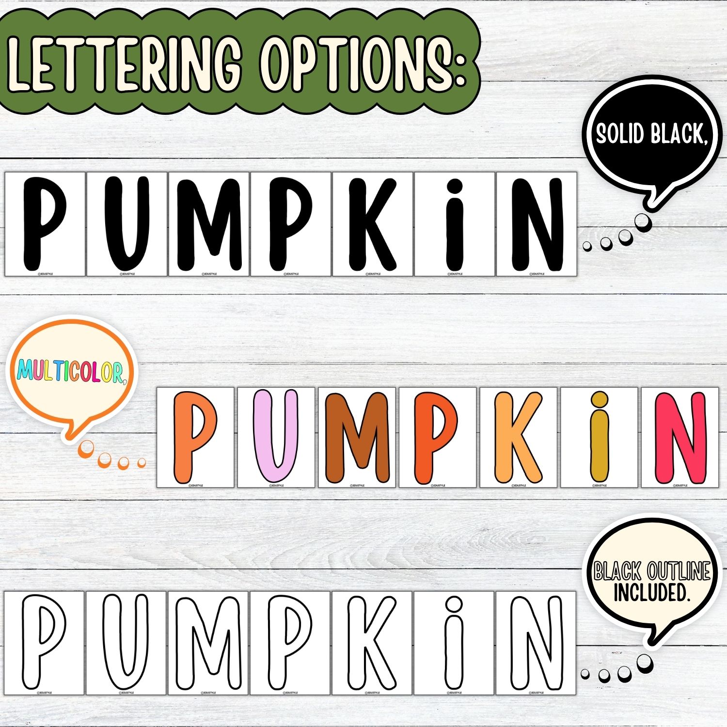 - Lettering Options: Multicolor, Solid Black, and Black Outline