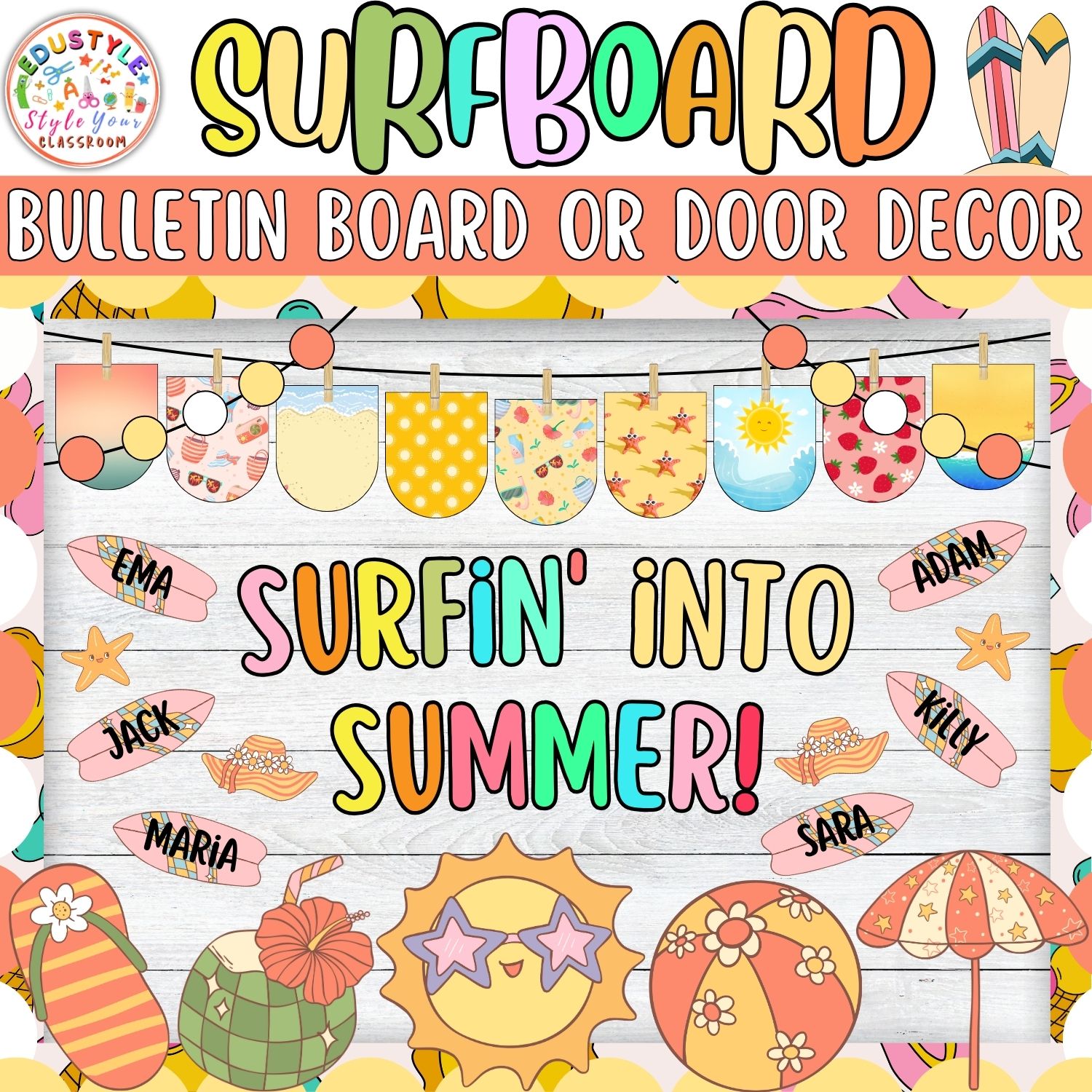Surfin’ Into Summer!: Surfboard & Summer Bulletin Board or Door Decor Kit | JuneSurfin’ Into Summer!: Surfboard & Summer Bulletin Board or Door Decor Kit | June