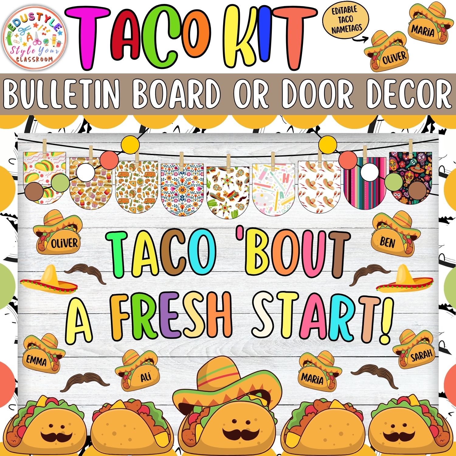 Turn your classroom into a fiesta of learning with this delightful Taco-Themed Bulletin Board & Door Decor Kit! Vibrant, fun, and filled with charming taco characters, colorful sombreros, mustaches, and editable taco nametags, this decoration set will inspire teamwork, positivity, and a zest for learning.