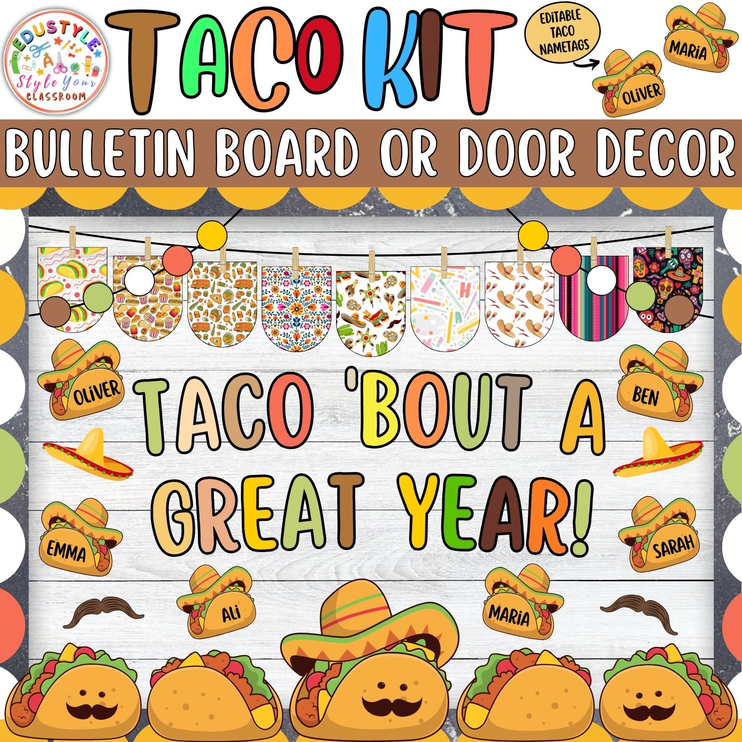 Turn your classroom into a fiesta of learning with this delightful Taco-Themed Bulletin Board & Door Decor Kit! Vibrant, fun, and filled with charming taco characters, colorful sombreros, mustaches, and editable taco nametags, this decoration set will inspire teamwork, positivity, and a zest for learning.