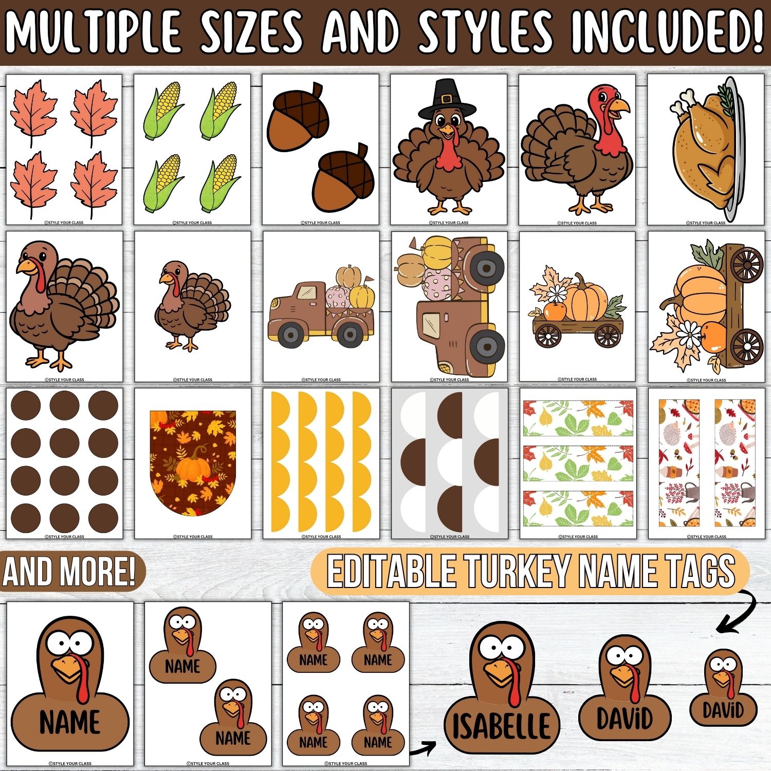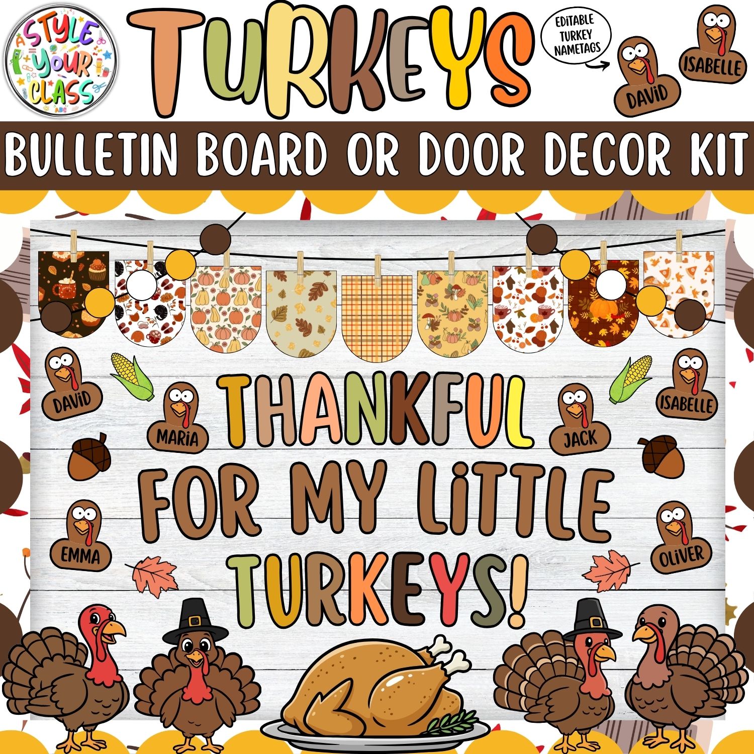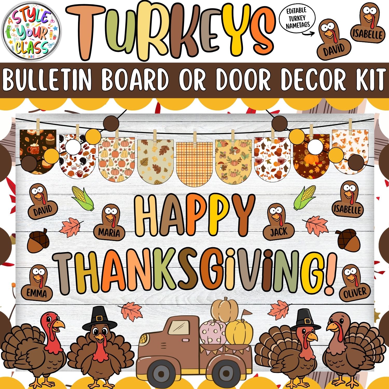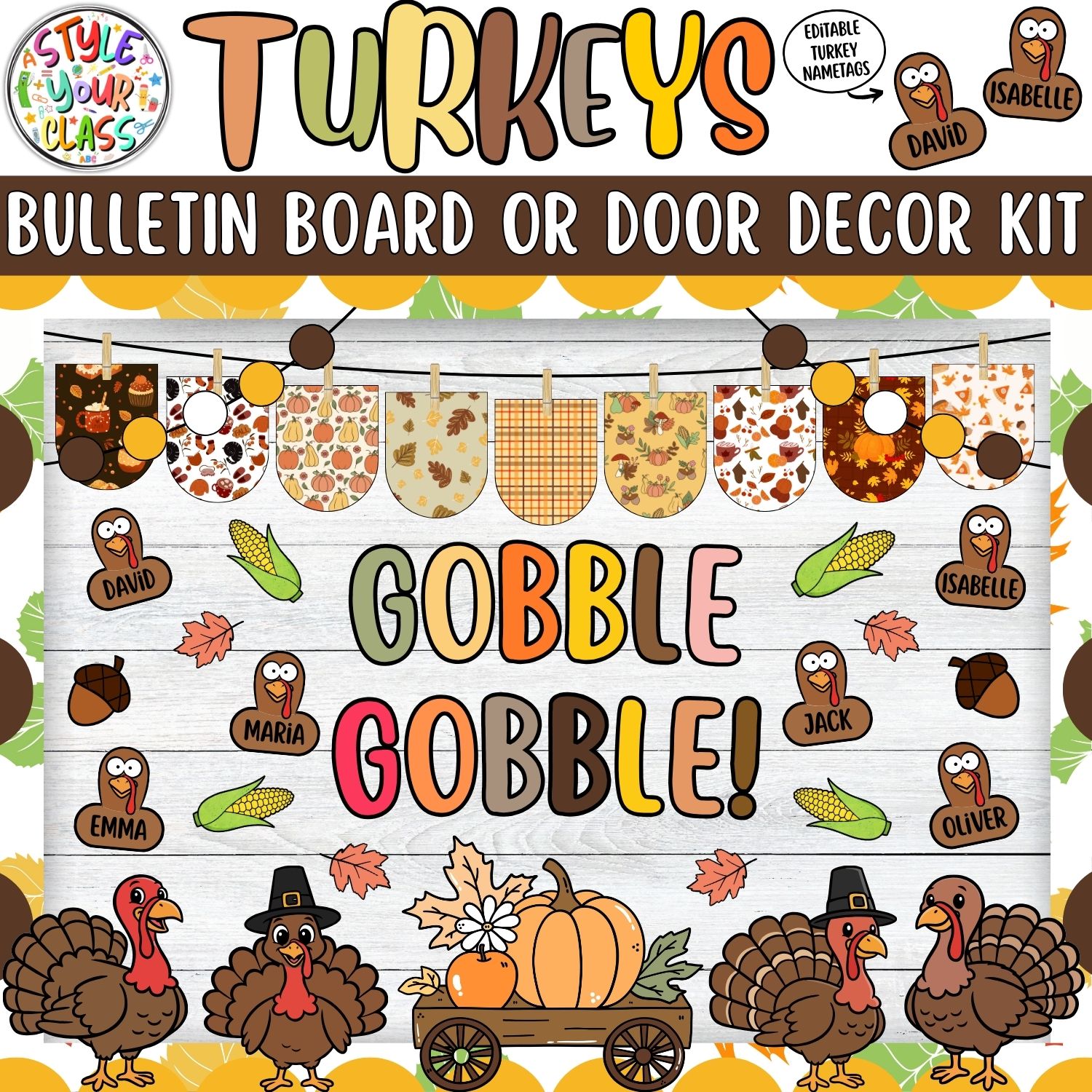 🦃 Turkey Thanksgiving Bulletin Board or Door Decor Kit – Editable Classroom Display