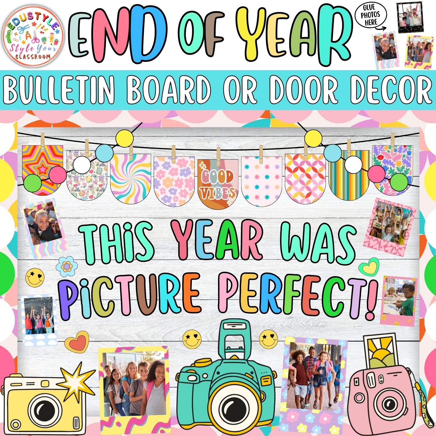 With colorful vintage-style cameras, bold lettering, photo-ready frames, and positive vibes, this set turns your bulletin board or classroom door into a photo-worthy memory lane. Ideal for elementary classrooms, it adds personality, excitement, and a big dose of color to any end-of-year celebration!