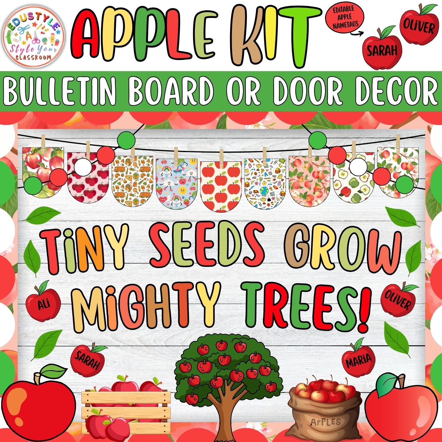 - This kit includes decorative apples, apple trees, baskets, vibrant patterned banners, editable name tags, and various lettering styles and motivational phrases.