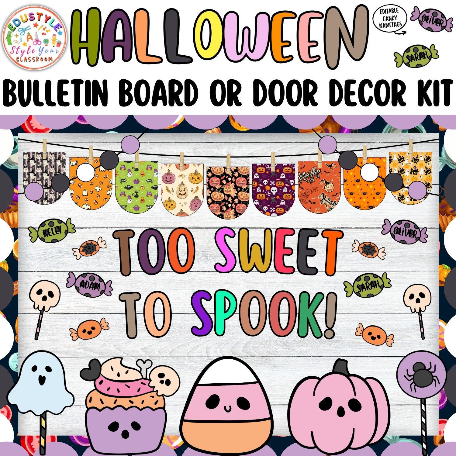The Too Sweet to Spook Halloween Bulletin Board and Door Decor Kit brings pastel fun and sugary charm to your classroom. With smiling ghosts, pastel pumpkins, cupcakes, and candy corn, this kit is the perfect balance of festive and friendly for younger students.