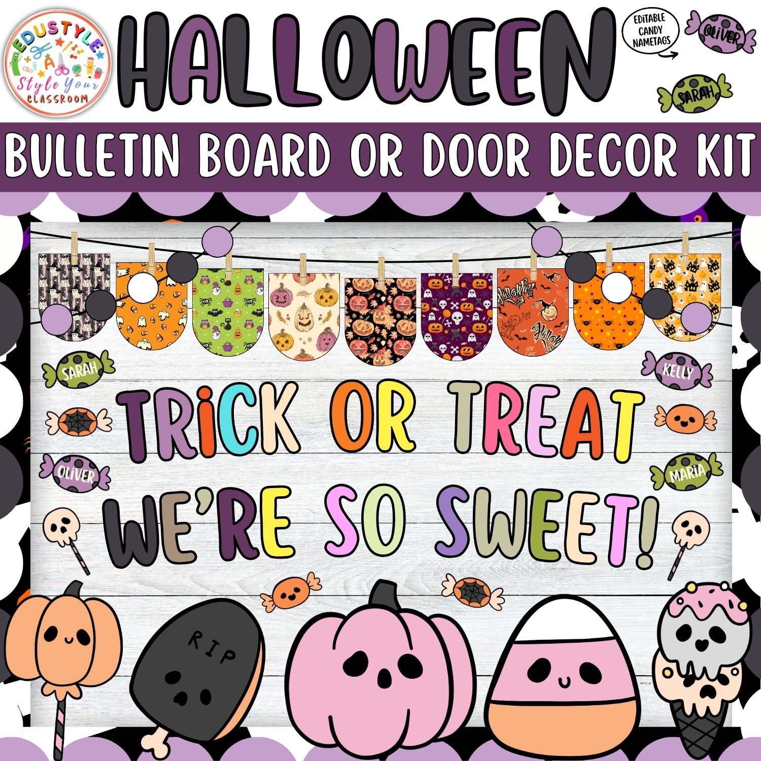 Add a sugary sweet twist to your October classroom decorations with this pastel-themed Halloween bulletin board and door decor kit! 🌈🎃