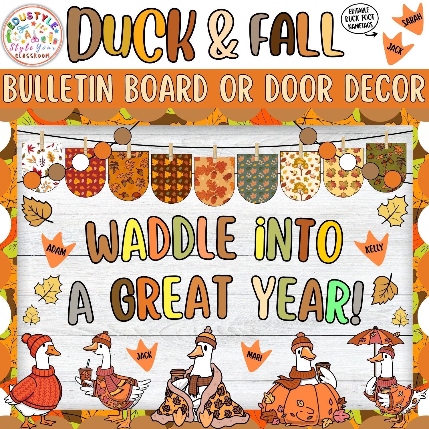 Welcome the cozy autumn season with our Duck & Fall Bulletin Board & Door Decor Kit! Perfect for creating a warm, inviting classroom environment, this set combines the charm of fall leaves, pumpkins, and adorable ducks dressed for autumn. With vibrant colors and editable elements, it’s an engaging way to celebrate fall, foster classroom community, and brighten up your walls, doors, or hallways.