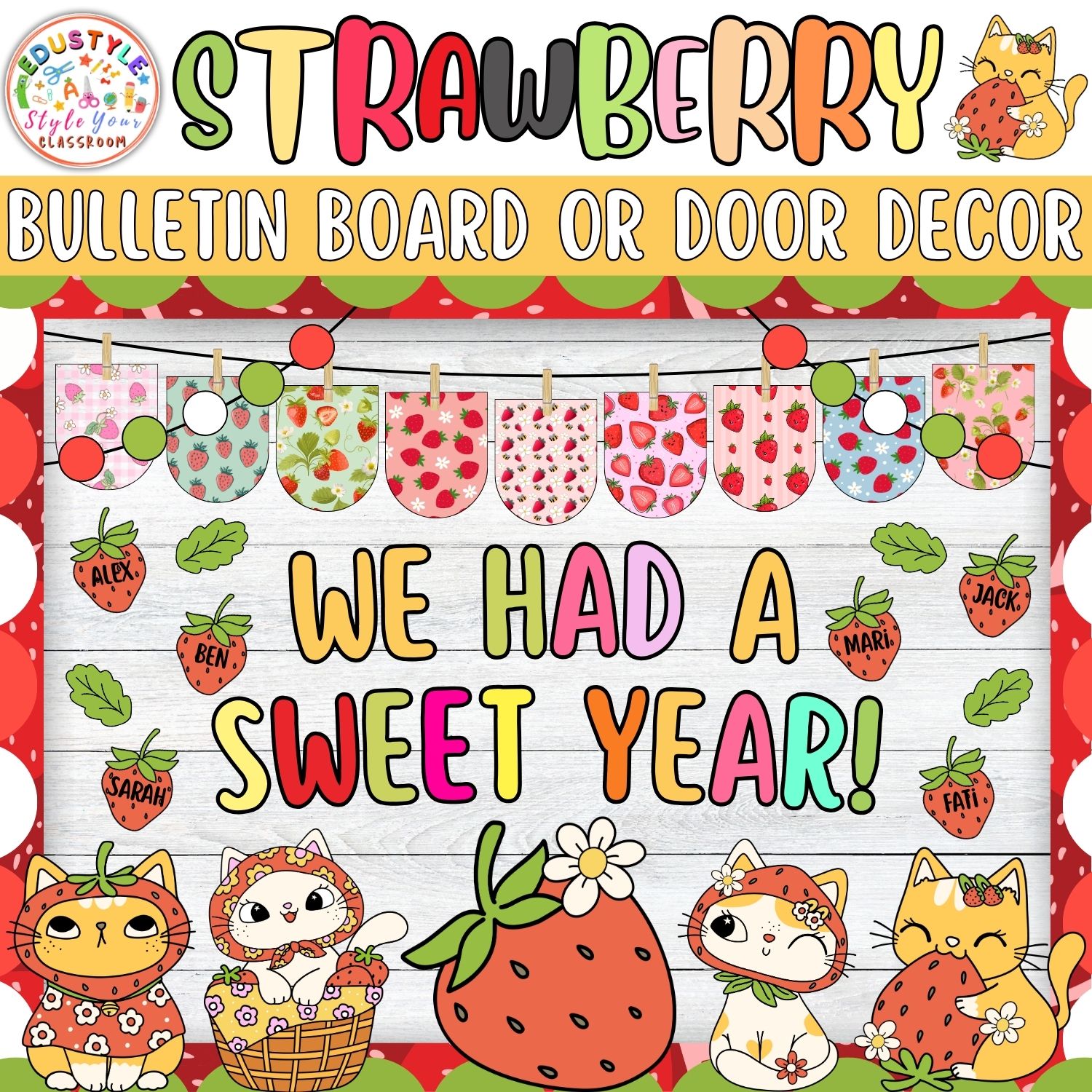 Celebrate summer vibes and classroom cuteness with this “We Had A Sweet Year!” Strawberry Bulletin Board & Door Decor Kit! Perfect for end-of-year celebrations, seasonal refreshes, or just adding fruity flair, this cheerful set features vibrant strawberry patterns, leafy accents, and the most adorable strawberry-dressed cat characters. Whether you’re welcoming summer or wrapping up the school year, this kit brings color, charm, and joy to any classroom space.