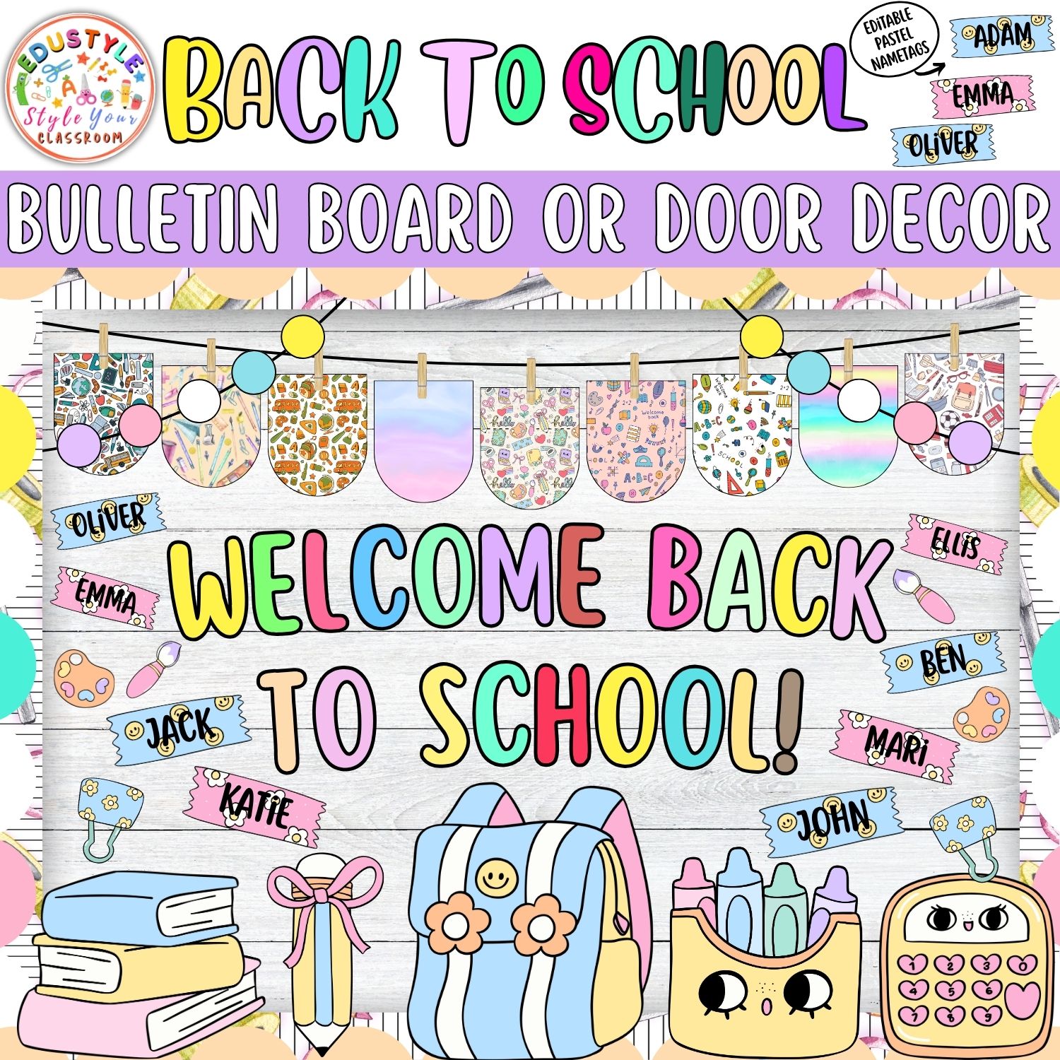 • Editable pastel name tags, allowing personalization for each student