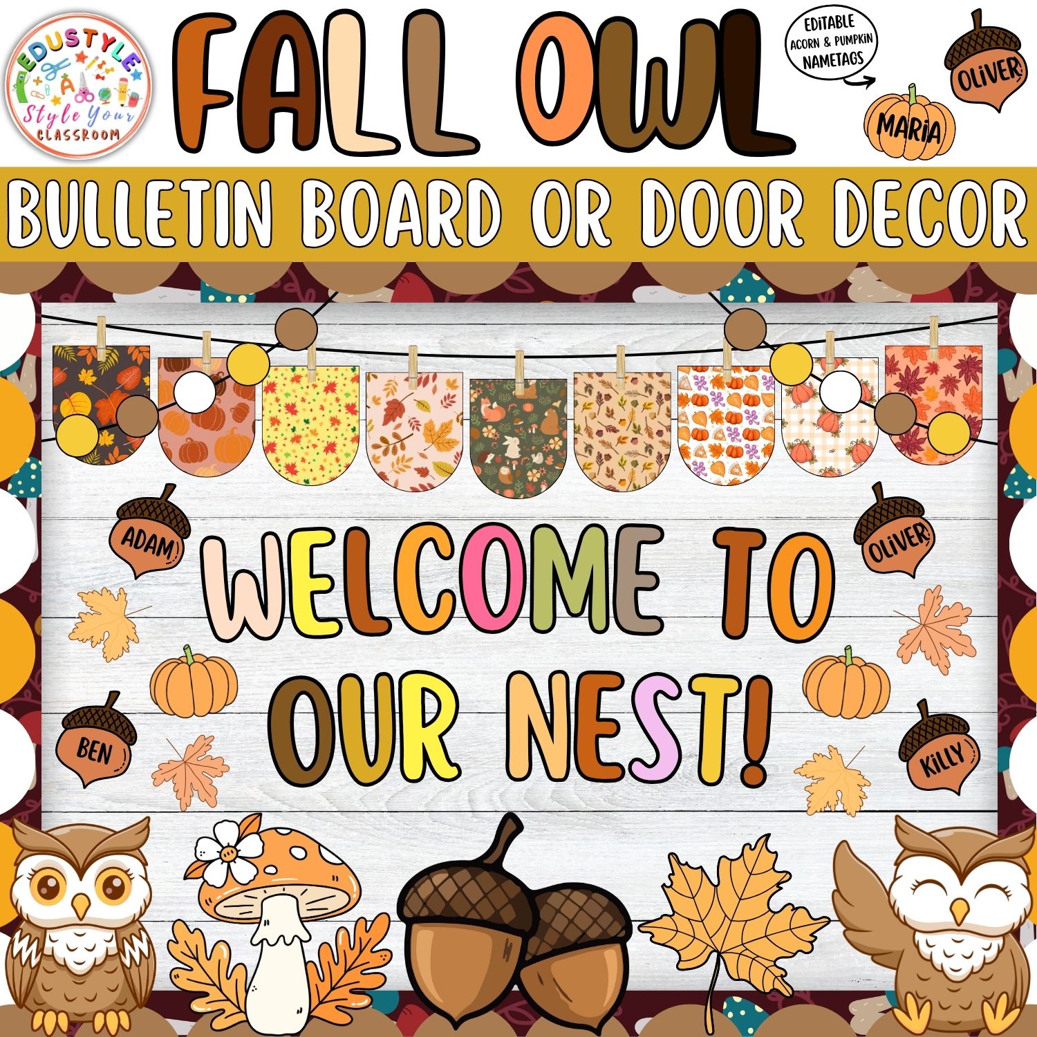 - Editable acorn & pumpkin name tags for easy personalization.