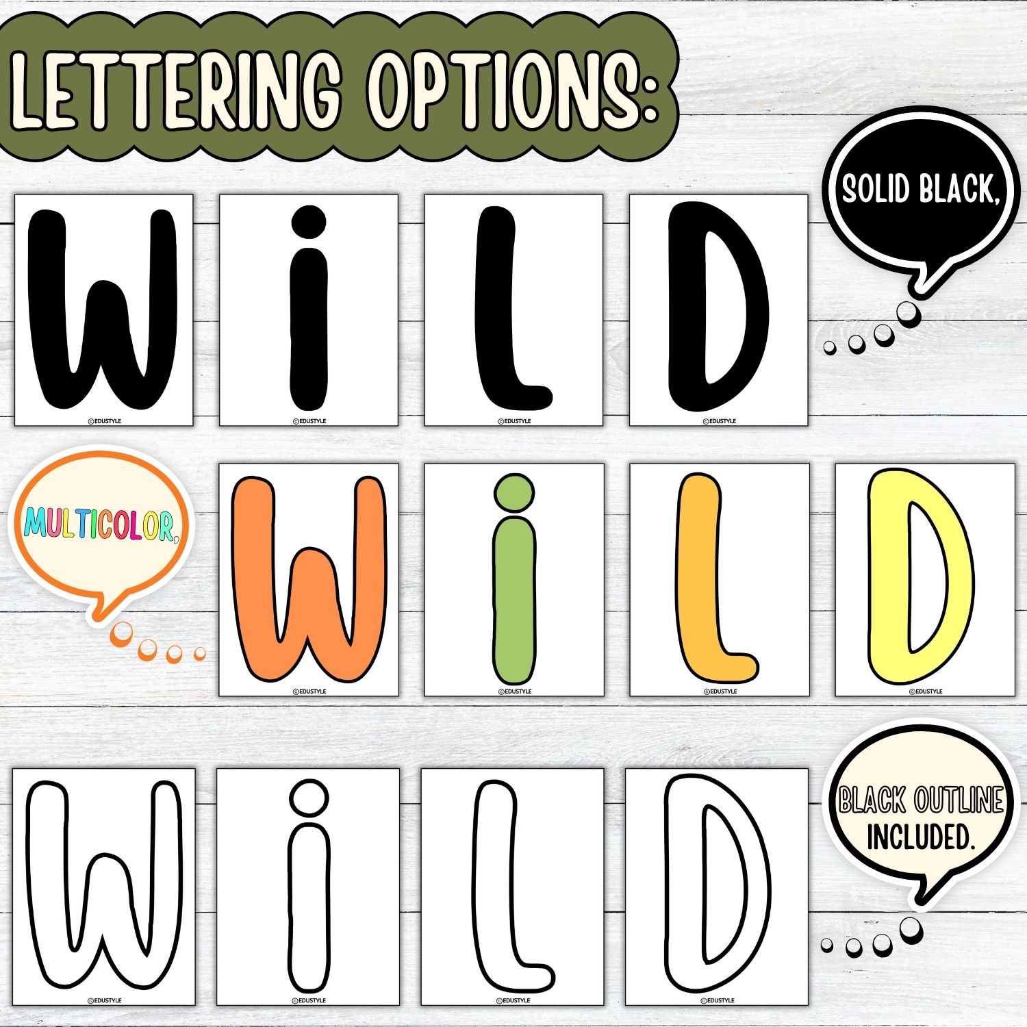 Central Messaging Options: Includes customizable letter sets like “Welcome to the Jungle!”, “Wild About Learning!”, and “Stay Wild, Read On!” in solid black, multicolor, and outline styles.