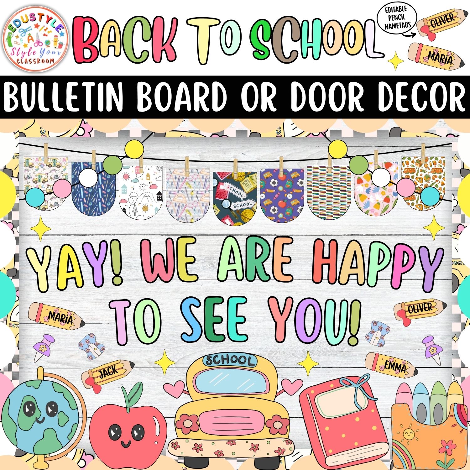 - Adorable classroom-themed decor pieces: smiling globe, apple, school bus, books, pencils, and more.